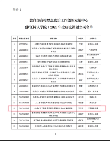 近日,教育部高校思想政治工作创新发展中心(浙江树人学院)公布了2025年度教育部高校思想政治工作创新发展中心(浙江树人学院)研究课题立项和预立项名单,由我校思政课教师王灵芝教授主持的《生成式人工智能意识形态舆情风险及应对策略研究》课题获研究课题立项。
