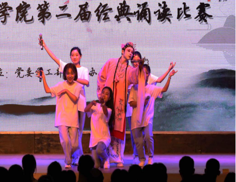 各学院带来的朗诵节目,既有充满学习氛围的《劝学》,又有抒豪情离恨的《龟虽寿》,豪情满怀的《经典咏流传》《品经典文学,展未来》,在或披肝沥胆,或激昂壮烈的配乐中,吟诵经典,抒发情感,师生们深情地演绎每一首诗词,都深深的感染了在座的每一位观众。服装设计学院带来的朗诵《屈原》,凛然悲壮、亢真刚烈,抒发了屈原热爱祖国的高尚感情;艺术设计学院带来的朗诵《少年中国说》,伴着激越的鼓声,字字铿锵有力,慷慨激昂,赢得了阵阵喝彩;时尚传媒学院带来的朗诵《经典咏流传》把师生带入一首首诗词的优美意境里,聆听优秀传统文化的“中国声音”;艺术设计学院带来的朗诵《我爱这土地》用朴实浑厚的嗓音饱含深情地表达出自己与土地生死相依的决心;商学院的朗诵《我的南方和北方》则带领大家一览祖国跨越南北的美景,展现了对大好河山的热爱和对民族复兴的充沛信心。最后,经典诵读大赛在艺术团带来的《经典回响新时代》中落下帷幕。