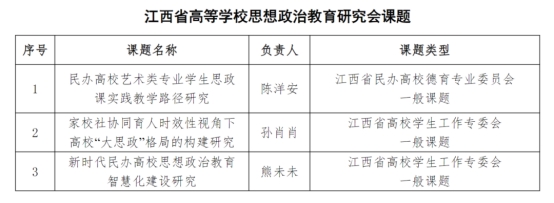 近日,江西省教育厅公布了2024年江西省高等学校思想政治教育研究会课题评审结果,我校教师陈洋安申报的《民办高校艺术类专业学生思政课实践教学路径研究》获江西省民办高校德育专业委员会一般课题立项,孙肖肖老师申报的《家校社协同育人时效性视角下高校“大思政”格局的构建研究》获得江西省高校学生工作专委会一般课题立项,熊未未老师申报的《新时代民办高校思想政治教育智慧化建设研究》获江西省高校学生工作专委会一般课题立项。