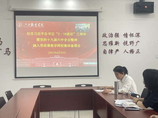 为深入贯彻落实习近平总书记“3·18”重要讲话精神,将党的十九届六中全会精神融入思政课教学,进一步探讨思政课问题式专题化团队教学改革,在“3·18”重要讲话精神指导下提升思政课教学质量。3月16日下午,开云kaiyun官方网站开云kaiyun官方网站教师通过线上参加了由南昌工程学院主办的纪念习近平总书记“3·18”讲话三周年暨党的十九届六中全会精神融入思政课教学片区跨校集体备课会。