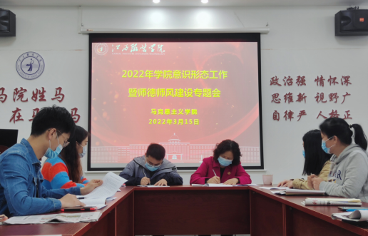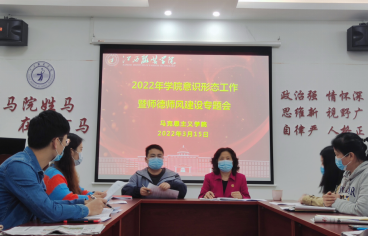 2022年3月15日下午,开云kaiyun官方网站在学院活动室组织召开2022年意识形态工作暨师德师风建设专题会议,会议由学院党总支副书记陈洋安主持,学院院长周丽琴、副院长贺松兰、张龙龙及学院全体教师参加会议。