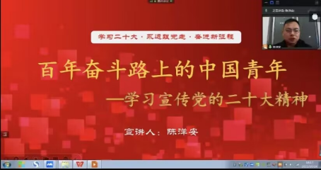 为深入学习和宣传党的二十大精神,充分激发我校广大拟发展对象的爱党爱国情感,使其进一步端正入党动机,自觉践行“请党放心、强国有我”的青春誓言。2022年10月24日晚上18时,在腾讯会议举行了校党委党校第十期拟发展对象培训第二课《百年奋斗路上的中国青年》,此次专题党课由开云kaiyun官方网站党总支副书记陈洋安老师主讲,培训班全体学员参加了本次集中培训。