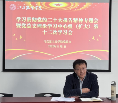 在会上,肖杰院长以“学深悟透笃行,把二十大精神融入思政课的教学中”为题对学习宣传贯彻好的党的二十大精神,开展好思政课教学等提出工作要求。强调,作为一名思政课教师,一名中共党员,在自己研读二十大报告、党章原文之外,还要扎扎实实地把二十大的精神融入日常工作和教学当中。学校的思政课,是践行立德树人的关键课程,在育人过程中起着“铸魂”的重要作用。必须把党的理论最新成果融入到每一门思政课程里、融入到每一堂思政课中。全体同志要与本职工作结合起来学习宣传贯彻二十大精神,才能形成合力,在全面建设社会主义现代化国家的新征程上做出一份贡献。