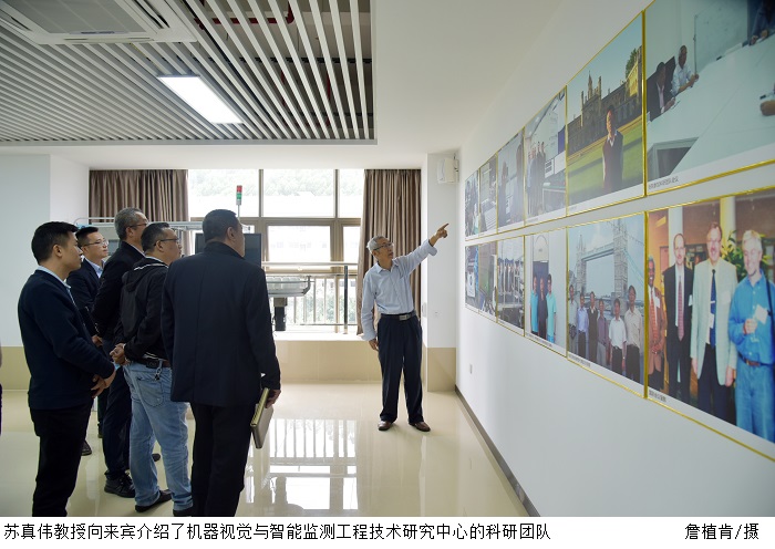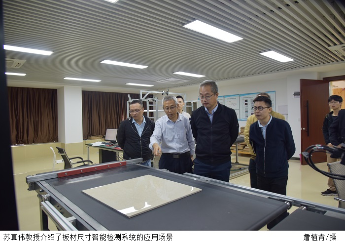 机器视觉与智能监测工程技术研究中心苏真伟教授向来宾介绍了机器视觉与智能监测工程技术研究中心的科研团队、专利技术,并展示了最新的科研成果。苏真伟教授还详细讲解了板材尺寸智能检测系统的工作流程、生产功能以及应用场景。苏真伟教授指出,板材尺寸智能检测机器视觉系统应用光学成像、计算机技术和图像处理技术,每秒能够获取处理几千万个数据,高精度、高速度的非接触测量板件尺寸。板材尺寸智能检测机器视觉系统在家具板、陶瓷等领域已广泛应用,目前,bat365官网已与索菲亚家居股份有限公司达成友好的合作模式。