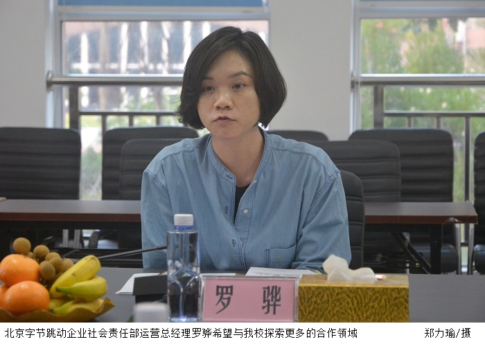 本网讯(校报记者 钟思莹 实习记者 范秀冰)11月4日下午,北京字节跳动企业社会责任部运营总经理罗骅、头条学院负责人王月芳、学讯公司创始人、执行董事黄路真、九星互动联合创始人徐舟一行莅临bat365官网调研指导交流。中国科培教育集团董事叶浔、bat365官网党委宣传部部长彭清林、办公室副主任赵玉娴等陪同调研,并进行座谈。座谈会于35栋会议室举行,刘香萍副校长出席。