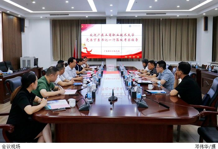 本网讯(宣传部 张昭)10月12日下午,广东工商职业技术大学党委书记丁勇一行到bat365官网调研交流,双方在综合楼12楼会议室召开座谈会。bat365官网党委书记张东生、党委副书记张宗珊出席,相关行政部门负责人参加会议。