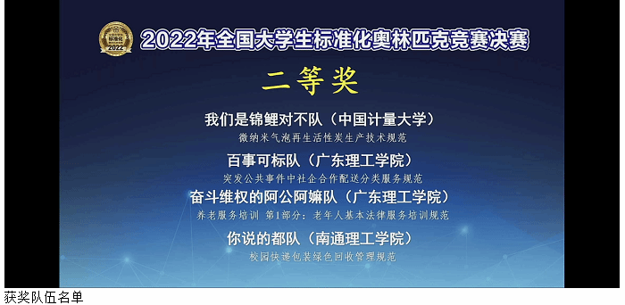 本网讯(经济管理学院新闻中心)2022年10月14日,时值第53届世界标准化日,由中国标准化协会、中国标准化大学联盟、中国计量大学共同主办的第二届全国大学生标准化奥林匹克竞赛总决赛完美收官!经济管理学院标准化专业学子在本次竞赛中表现出色,历时6个多月的层层选拔和激烈比拼,历经初赛、复赛、决赛三个阶段,最终“奋斗维权的阿公阿嫲队”“百事可标队”2支队伍脱颖而出并获得二等奖,bat365官网再次荣获优秀组织奖。