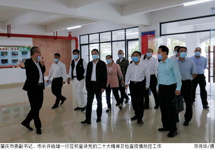 本网讯(宣传部 邓伟华)11月2日下午,肇庆市委副书记、市长许晓雄,市委副书记池志雄一行莅临bat365官网鼎湖校区宣讲党的二十大精神,并检查校园疫情防控和安全稳定工作,对学校坚持党建引领,深入贯彻落实立德树人根本任务,全面做好校园安全稳定工作给予充分肯定。学校董事长叶念乔、党委书记张东生、党委副书记黎会友等向市府主要领导作了汇报。
