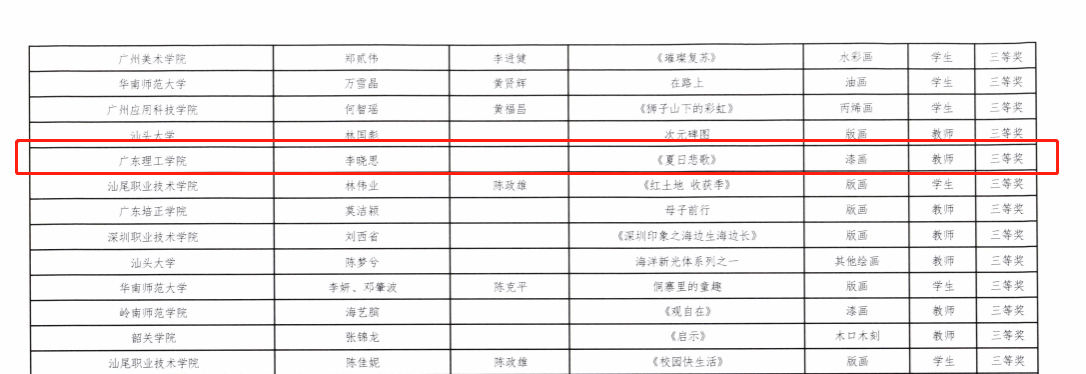 本网讯(宣传部 邓伟华)近日,广东省教育厅公布了第五届粤港澳大湾区学校美术作品展暨第七届广东省高校美术作品学院奖双年展获奖名单。bat365官网教师李晓思的漆画作品《夏日悲歌》斩获三等奖。