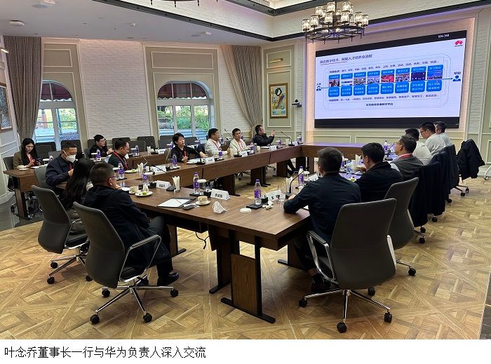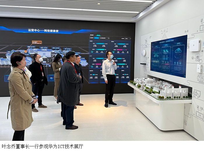 在华为广东区域总经理李子绪的陪同下,叶念乔董事长一行先后参观了客户交流中心,体验华为面向教育行业客户的沉浸式场景化建设方案;走访ICT技术展厅,了解整体ICT技术的实际应用;观摩智慧园区体验中心,听取智慧园区数字化运营系统的介绍。通过参观、走访、观摩,深入了解华为的发展历程及在推进数字化、信息化、智能化建设,以及企业文化建设等方面的行业优势。