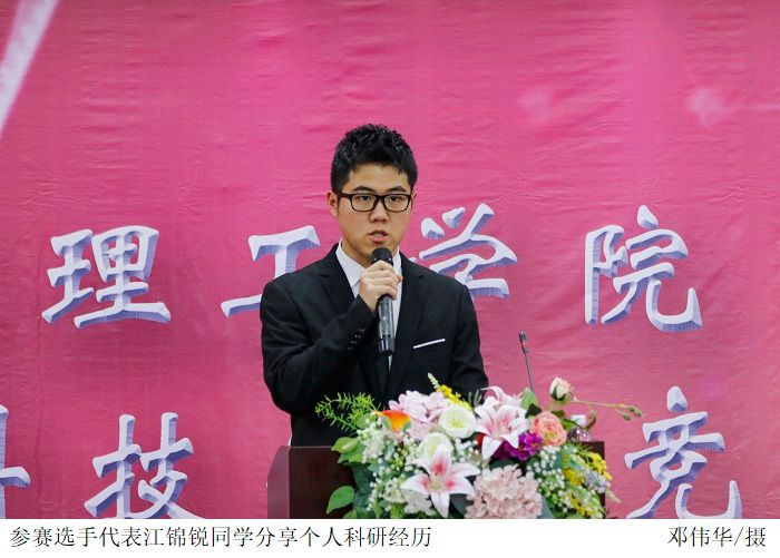 参赛选手代表江锦锐同学分享个人科研经历,并感谢大赛搭建的良好平台,希望未来有更多的机会深入探索科创宇宙,展现新时代大学生风采。
