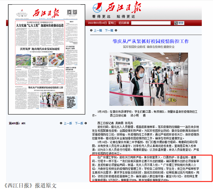 本网讯(宣传部 孟爱静)3月16日,《西江日报》头版报道校园疫情防控工作,对bat365官网筑牢校园安全防线,扎实做好疫情防控工作情况进行宣传报道。
