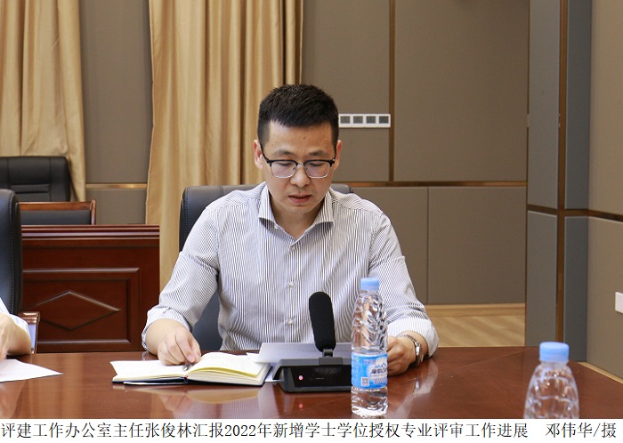 会上,评建工作办公室主任张俊林汇报2022年新增学士学位授权专业评审工作进展。
