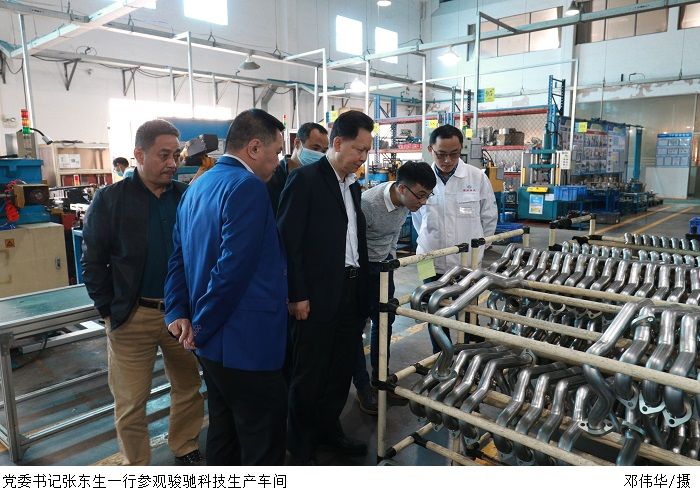 在广东骏驰科技股份有限公司,人事部经理曹应红介绍公司汽车配件研究方向与人才需求。双方就校企合作方面进行深入探讨。随后,在副总裁刘毅勇陪同下,张东生一行参观了骏驰科技的生产车间。
