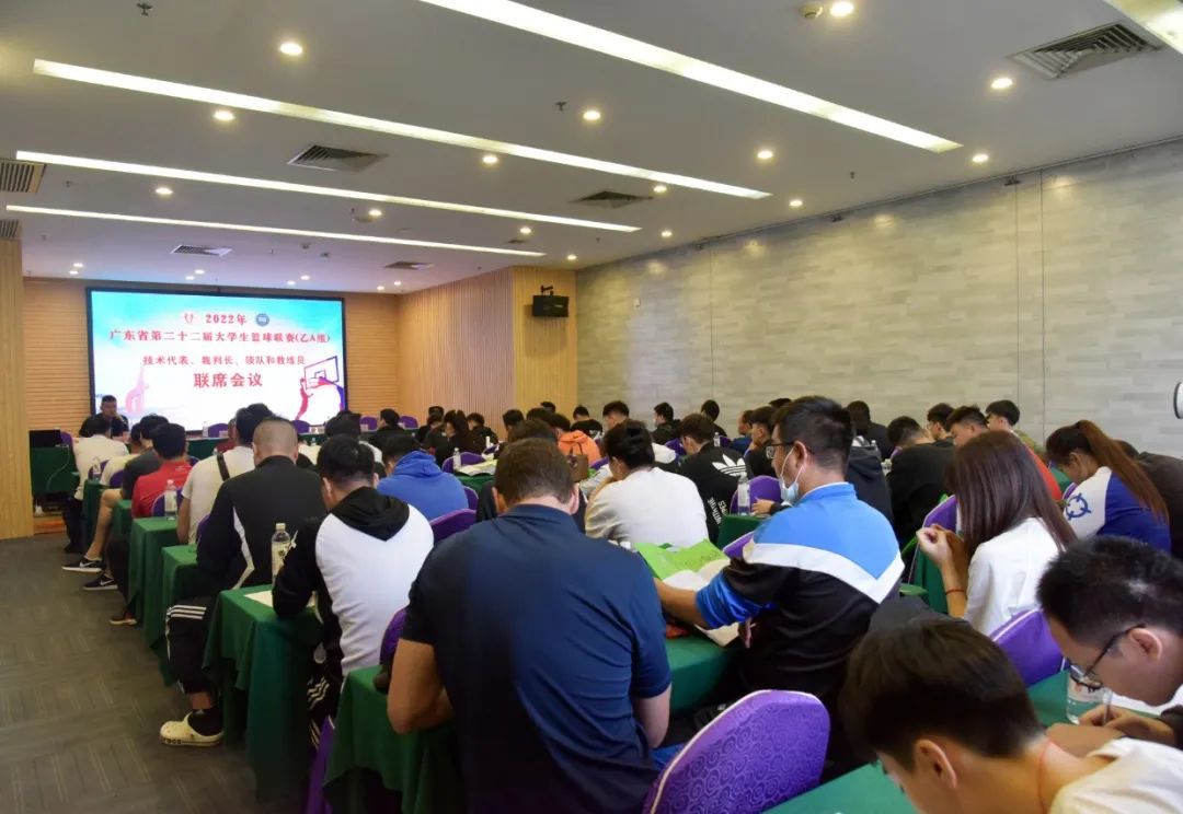 广东省教育厅体卫艺处三级调研员董业权,广东省学生体育艺术联合会副会长、大赛监督周二三,广东省学生体育艺术联合会副会长、大赛仲裁徐泽,广东省学生体育艺术联合会篮球分会专家委员会、大赛仲裁许成,广东省学生体育艺术联合会篮球分会裁委会副主任、大赛裁判长杨晓光及各参赛队领队、教练员出席会议。