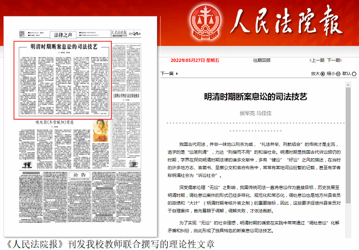 本网讯(马克思主义学院 陈洪超)5月27日,《人民法院报》刊发了bat365官网侯军亮和马佳佳两位老师联合撰写的论文《明清时期断案息讼的司法技艺》。
