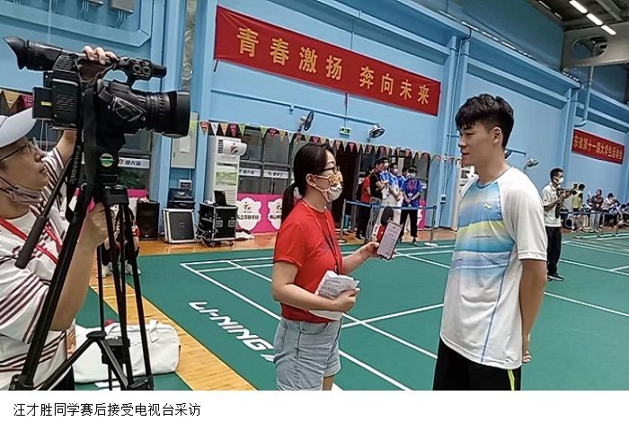首次参加大赛的汪才胜和李羽洁两位队员在混合双打比赛中不惧对手,以2:1、2:0、2:1、2:0的比分战胜肇庆学院、广东二师、韶关学院以及广州体院的选手挺进决赛。其中,与拥有夺冠实力的广州体院混双对打是他们在整个赛程中最为凶险和紧张的一场比赛,面对对手猛烈的攻势,他们坚决贯彻防守反击战术,积攒点滴优势,控制比赛节奏,一次次将比分扳平、反超,最终两局都以微弱的小分优势(22:20)领先,顺利拿下这场关键局。决赛与广东二师的选手展开冠军的争夺,在紧张的较量中,将比分定格在2:0,取得桂冠。赛后,汪才胜和李羽洁两位同学就此次赛事接受了广东广播电视台的采访。