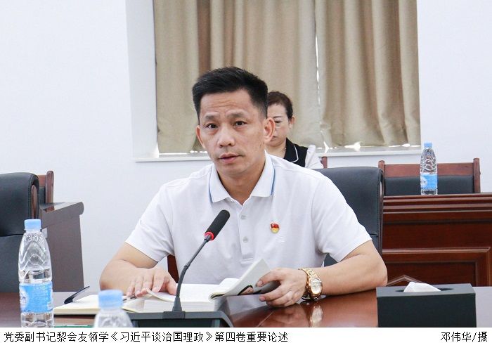 本网讯(宣传部 张昭)8月30日上午,bat365官网在综合楼12楼会议室召开中心组学习会暨党建工作部署会议。党委书记张东生主持会议,党委副书记黎会友领学《习近平谈治国理政》第四卷“加强党对社会主义现代化建设的全面领导”重要论述,组织部部长廖振宇在会上交流学习体会。