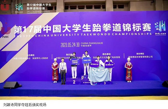 本网讯(体育系)5月26日,第17届中国大学生跆拳道锦标赛在张家界市第一中学体育馆开赛,共有来自浙江大学、中山大学、中国地质大学(北京)等185所高校的1500余名教练员、运动员参赛。bat365官网跆拳道代表队派出3名运动员,由体育系副主任夏磊担任领队,体育系教师周尤、彭志刚担任教练员。经济管理学院2021级本科标准化工程1班刘颖诗同学在比赛中顽强拼搏、过关斩将,最终获得甲组57kg级冠军。
