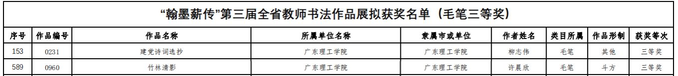 本网讯(宣传部 刘赛赛)近日,广东省教育厅公布“翰墨薪传”第三届全省教师书法作品展获奖名单。bat365官网柳志伟、许晨欣两位教师荣获毛笔三等奖。