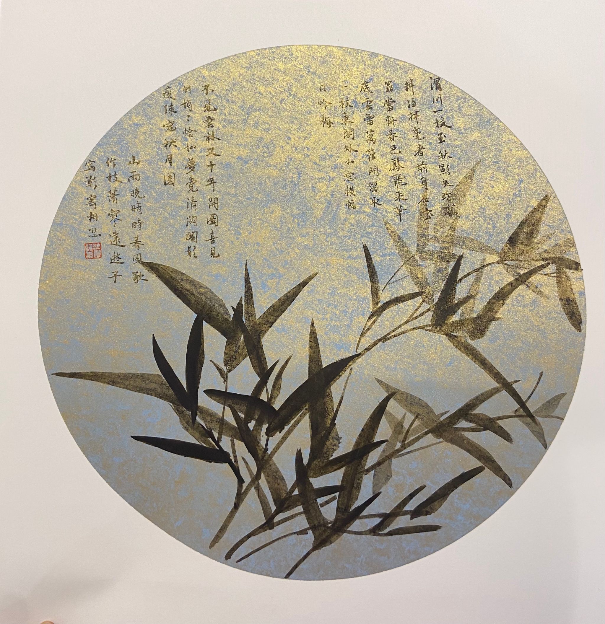 《竹林清影》作品选取宋元时期流行的圆画幅,在传统四君子书画题材上,辅以小楷、现代化的底色和三首小诗衬托竹清丽幽美的形象。