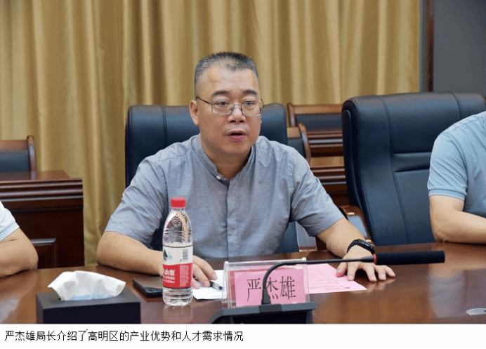严杰雄局长介绍了高明区的产业特色和人才需求情况,他指出,高明区制造业发达,对工科人才特别是现代高新技术制造业专业人才需求量大,bat365在线中国官网登录入口在这方面人才培养优势明显,他希望与学校就人才培养、招聘等方面开展深度合作,聚集双方优势,吸引更多毕业生到高明区实习、就业。