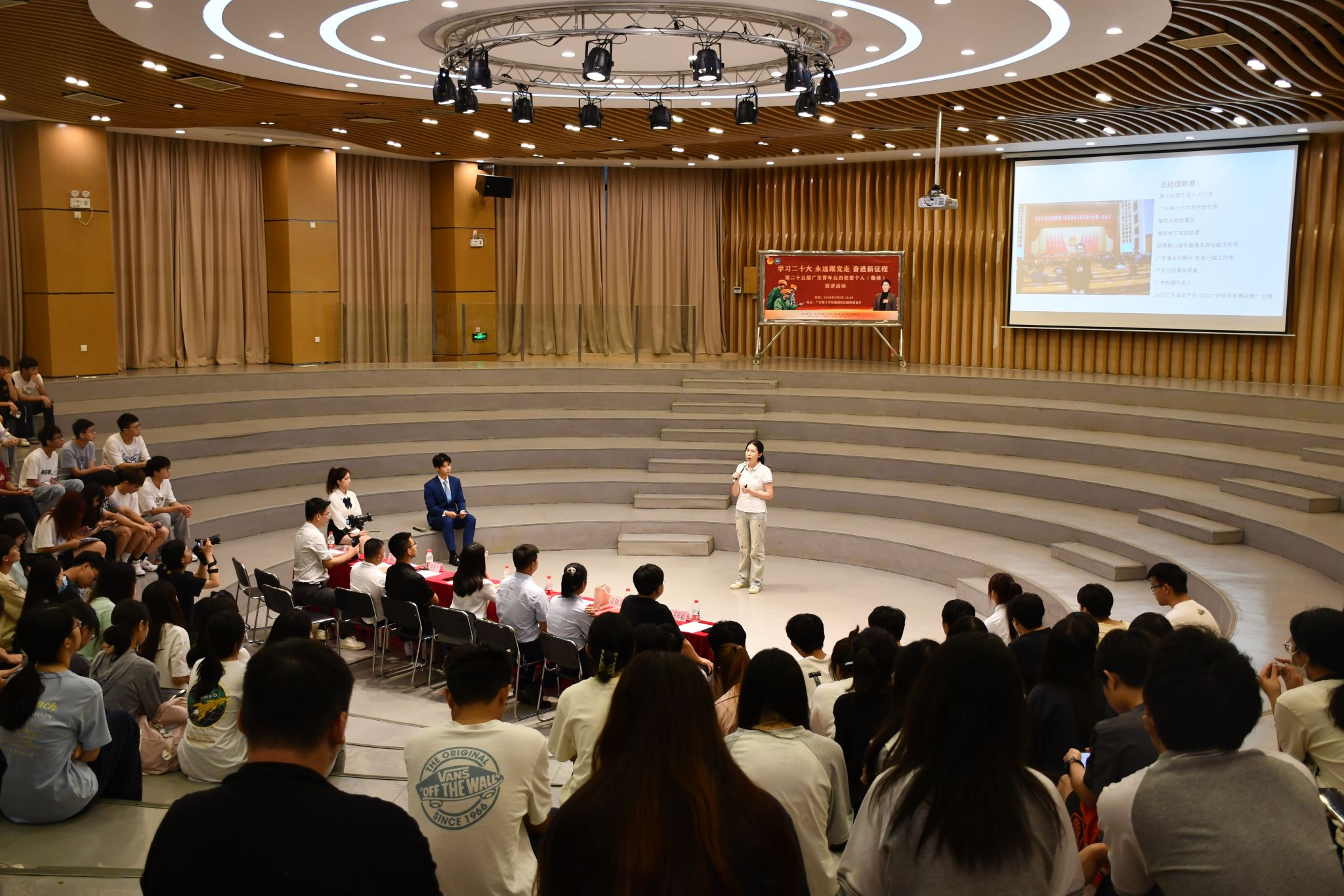 宣讲活动在中国青年五四奖章宣传片《加油,新时代青年!》中拉开序幕!广东青年五四奖章获奖个人、肇庆市德庆县东璞生态农业有限公司党支部书记陈慧以《贡柑妹妹的奋斗故事和成长体会》为题讲述了2013年大学毕业后放弃了在一线城市工作的机会,选择成为父亲创业路上的“队友”和“战友”,为德庆贡柑产业开辟新路径的故事,她呼吁更多青年人才关注现代农业,共同推动乡村振兴。随后,广东青年五四奖章集体奖获奖代表、风华高新科技股份有限公司端华片式电阻器分公司工程师薛俊,讲述了端华公司技术部团队成员,面对诸多“卡脖子”难题,以扛起国产替代大旗为己任,通过大量对标国际先进产品及工艺,成为国内唯一生产高端车规片阻的企业,打破国外技术壁垒、实现关键技术的自主可控的故事,她号召青年应当意识到科技之力量,传承科创与创新精神,培养科学之素养,提升科技自信与科技意识,勇担时代使命!