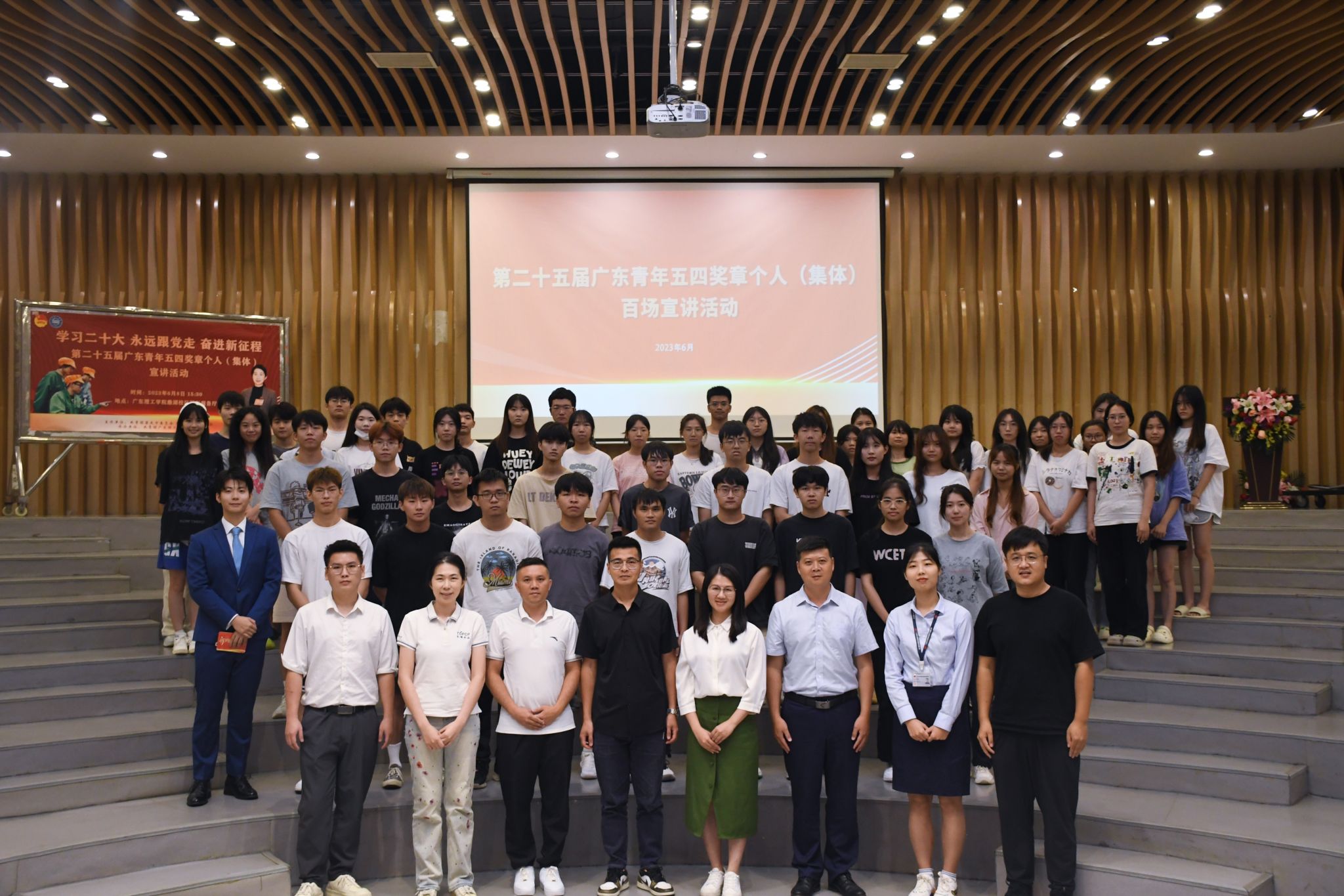 本网讯(校团委吴良超)为深入学习贯彻党的二十大精神,展示新时代团员青年的精神品格和价值追求,发挥青年典型模范带头作用,激励青年学子踔厉奋发、向榜样看齐。6月8日下午,在团市委的安排下,“学习二十大、永远跟党走、奋进新征程”广东青年五四奖章个人(集体)百场宣讲活动bat365在线中国官网登录入口专场在鼎湖校区圆形报告厅顺利举行。团市委组织部副部长张颖宜、经济管理学院党总支副书记吴楚升、建设学院党总支副书记焦根平、校团委专职团干吴良超及宣讲团随行人员出席此次活动。