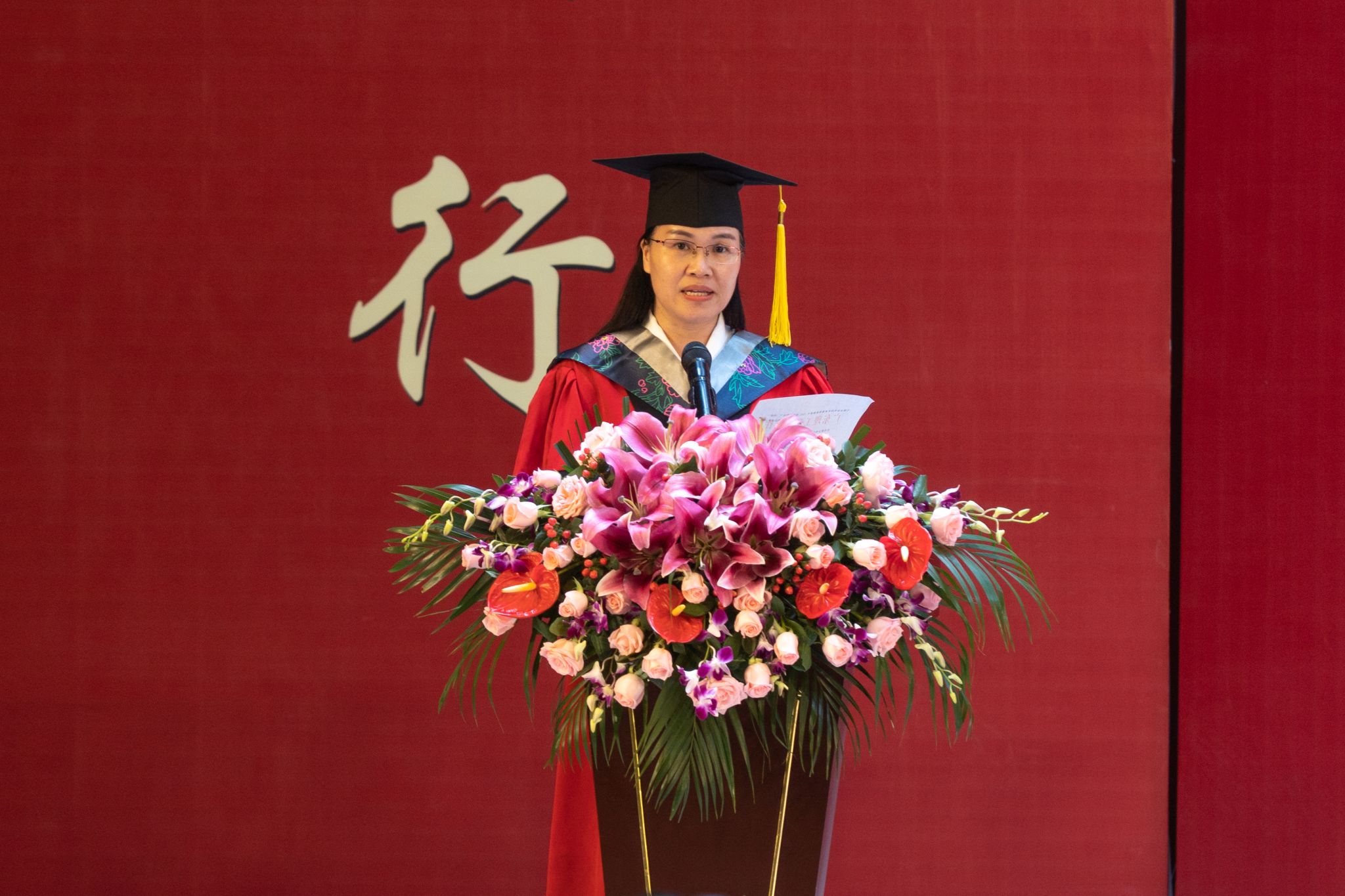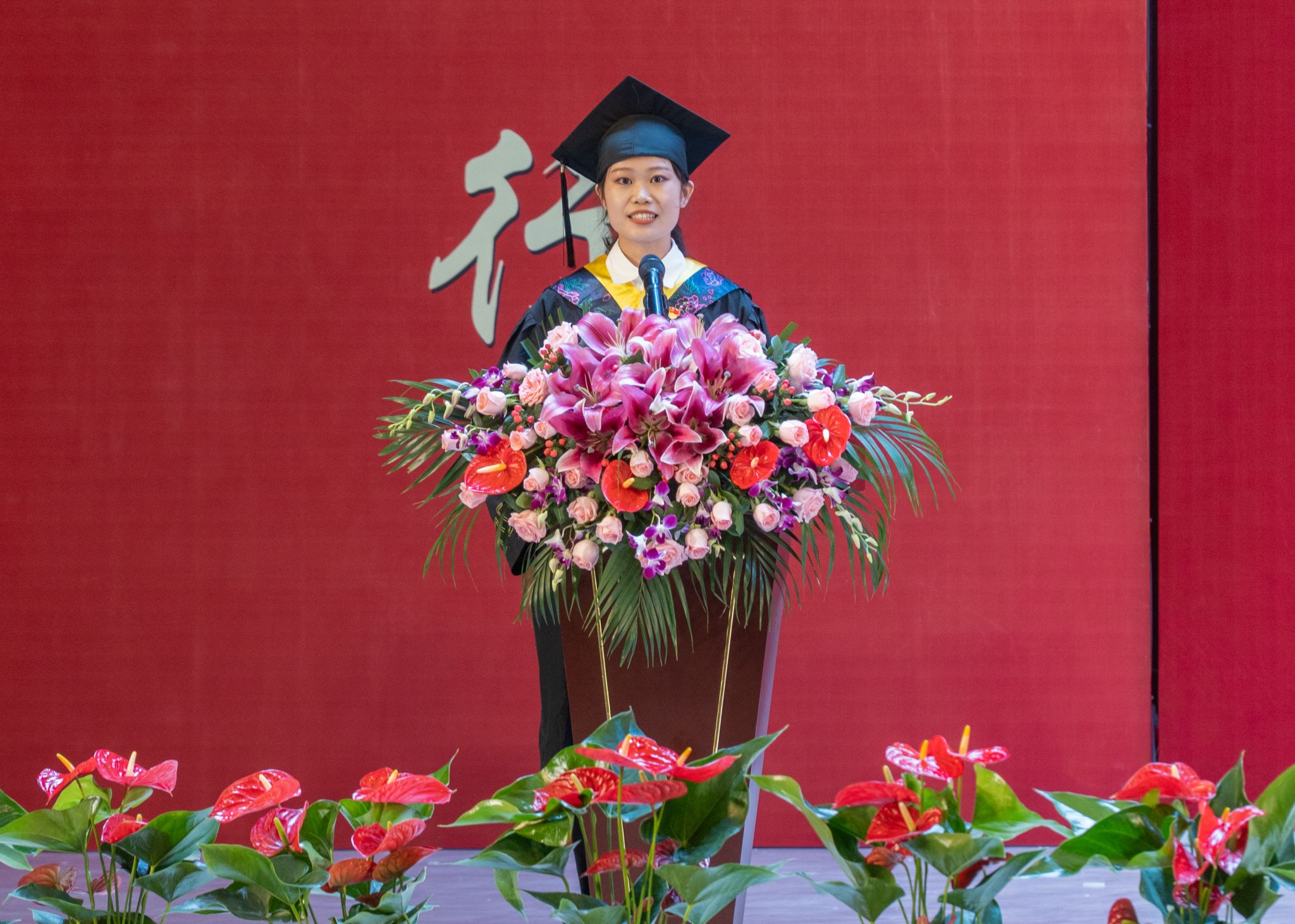 毕业生代表、2019级风景园林专业梁钰英同学代表全体毕业生向学校、学院、老师和辅导员表示感谢。她谈到,相信大家都能在自己的工作岗位上展现广理人的独有风采,“修德、求是、笃行、创新”不只是烂熟于心的校训,更是每一位广理学子铭刻在心底的一份信念。