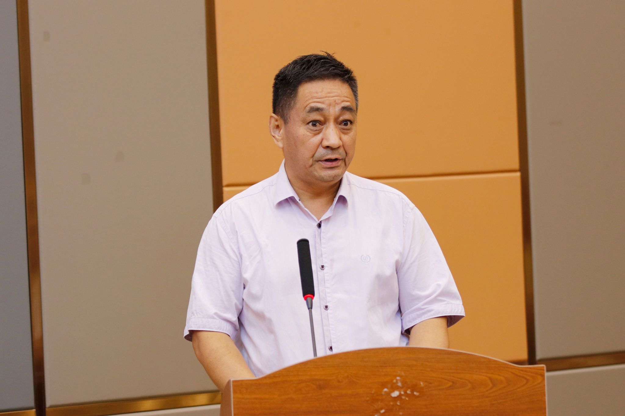 学生处处长谭蒙革宣读秋季入伍预定新兵名单,参会领导为他们佩戴绶带与大红花,建设学院2019级本科工程管理3班蒋智同学作为新兵代表发言。