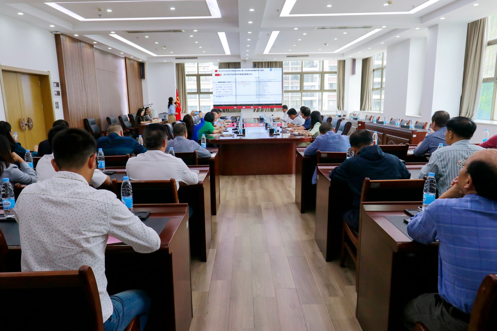 本网讯(宣传部)2023年10月11日,学校党委于综合楼12楼会议室举办学习贯彻习近平新时代中国特色社会主义思想主题教育第四次读书班,副校长王义宁作专题报告。党委书记张东生主持报告会。党委正副书记、正副校长,校长助理、党委部门正职负责人、行政部门党员正职负责人、各党总支书记(含中专党总支)、直属党支部书记、马克思主义学院院长等参加本次报告会。