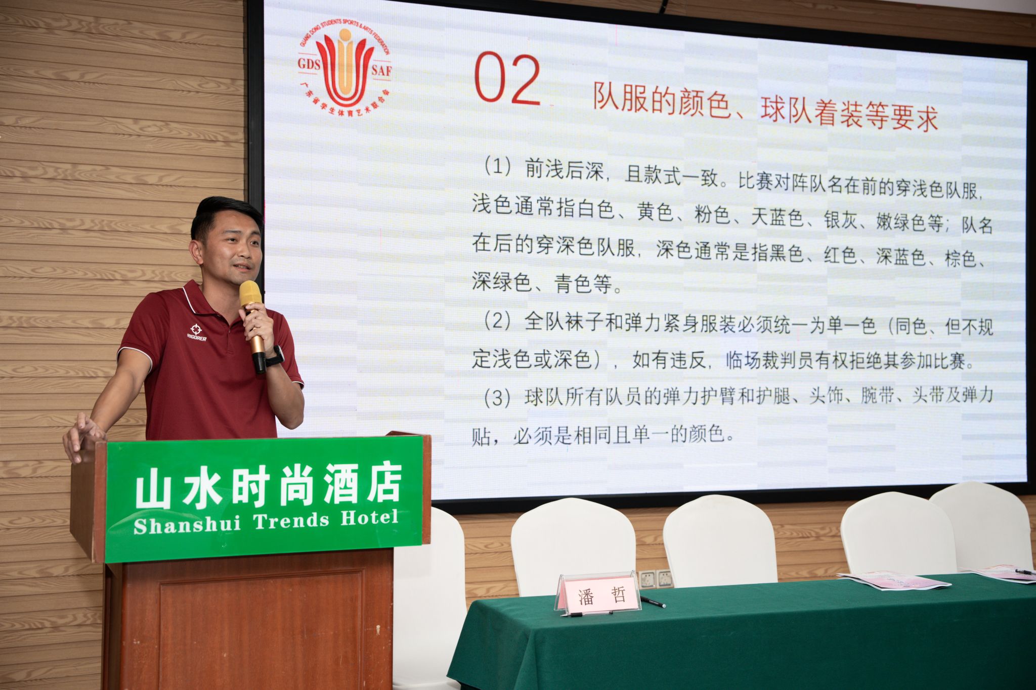 中国大学生体育协会理事、广东省学生体育艺术联合会常务副会长郭鼎文先生就赛事组织宣传、赛事安全监管、赛风赛纪、服务保障等方面提出要求,并要求各高校领队和教练要做好表率作用,引导球队和队员尊重对手、尊重裁判、尊重观众,把比赛作为互相学习、互相交流和互相提高的平台和机会。