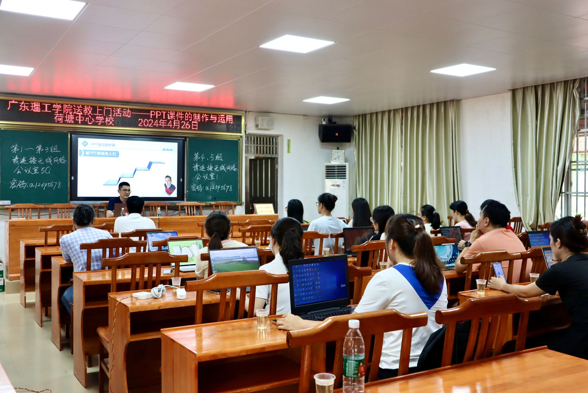 林显宁副教授以“PPT课件的制作与运用”为主题,通过讲解和演示,让石板一中、石板中心学校、荷塘中心学校老师们掌握PPT设计法则、设计思路、制作要点等,以及学习利用 AI 技术快速制作课件的方法,提高教师信息技术应用能力,提升教师教学质量和教学效率。