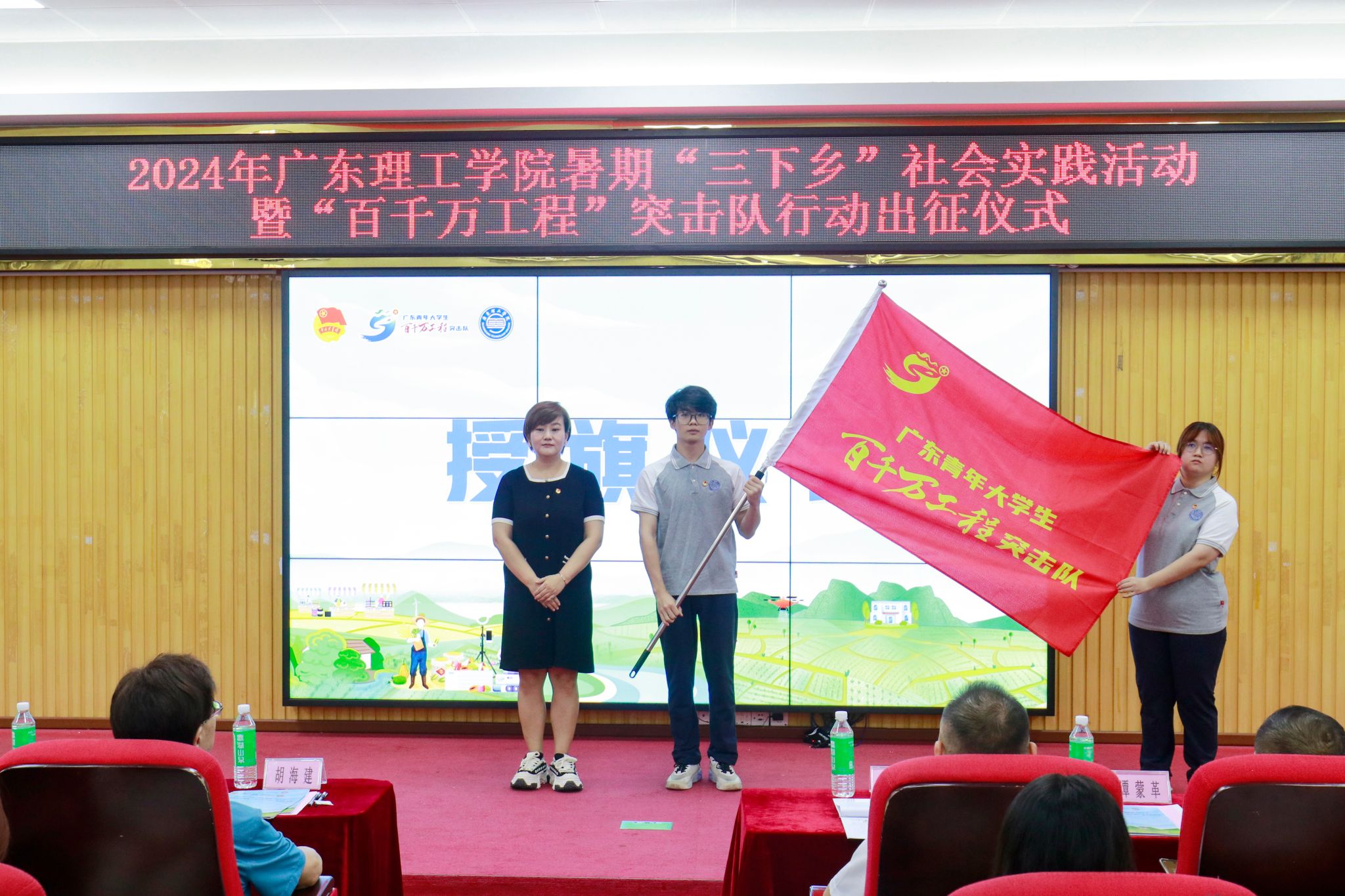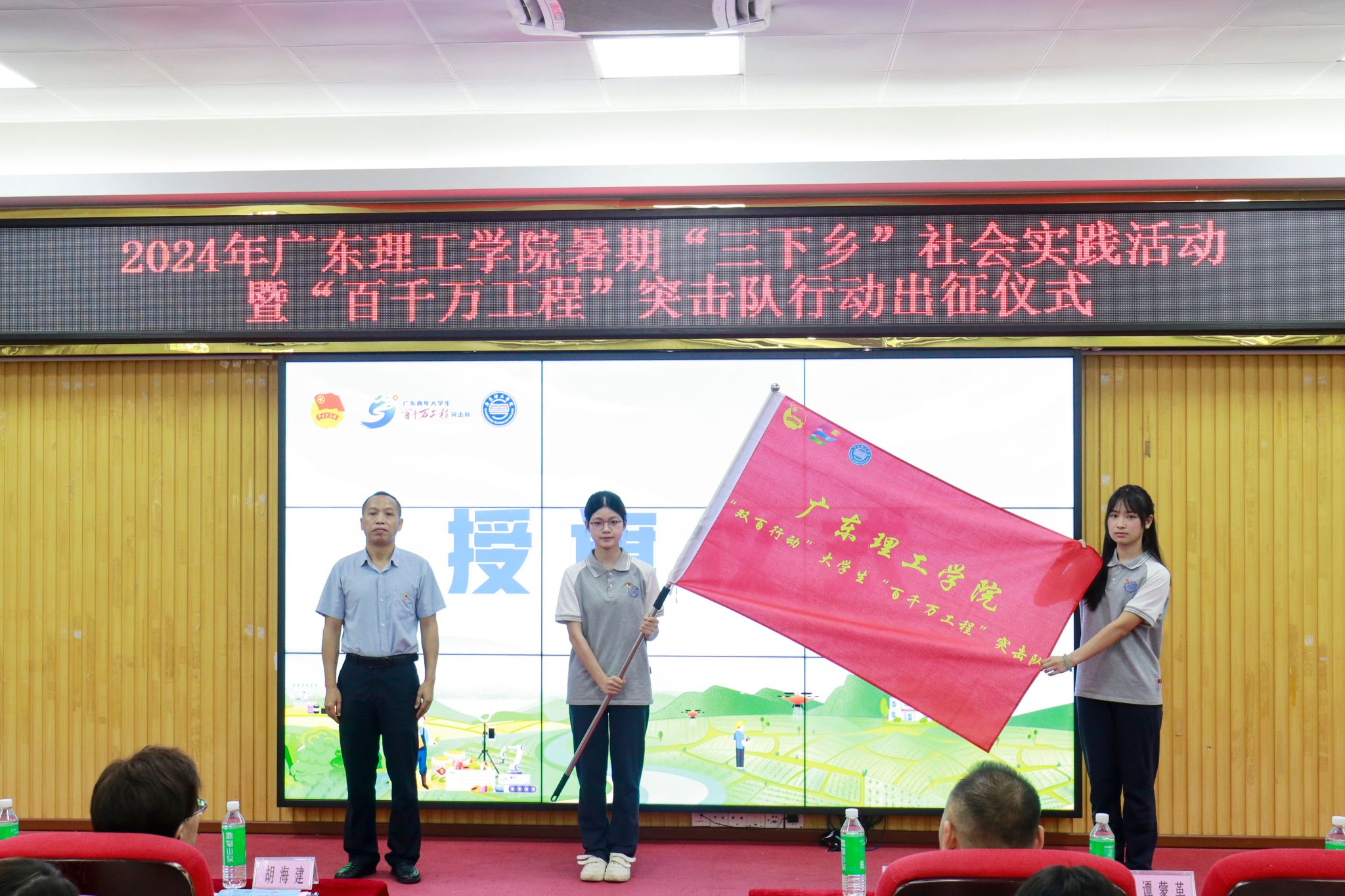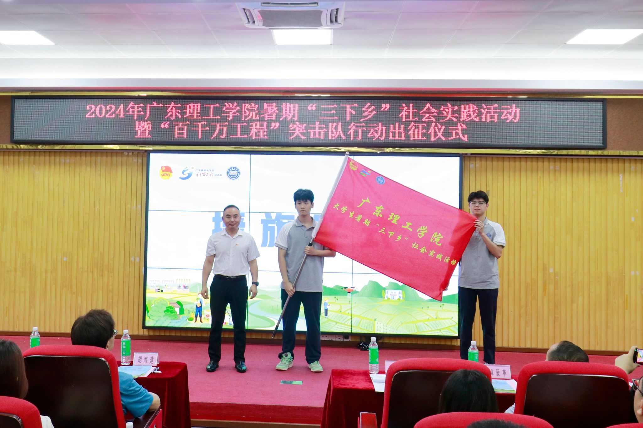 授旗仪式上,廖振宇、张冬、谭蒙革分别为突击队代表授“bat365在线中国官网登录入口大学生暑期‘三下乡’社会实践活动”总旗、“广东青年大学生‘百千万工程’突击队”旗帜及“双百行动”活动总旗。
