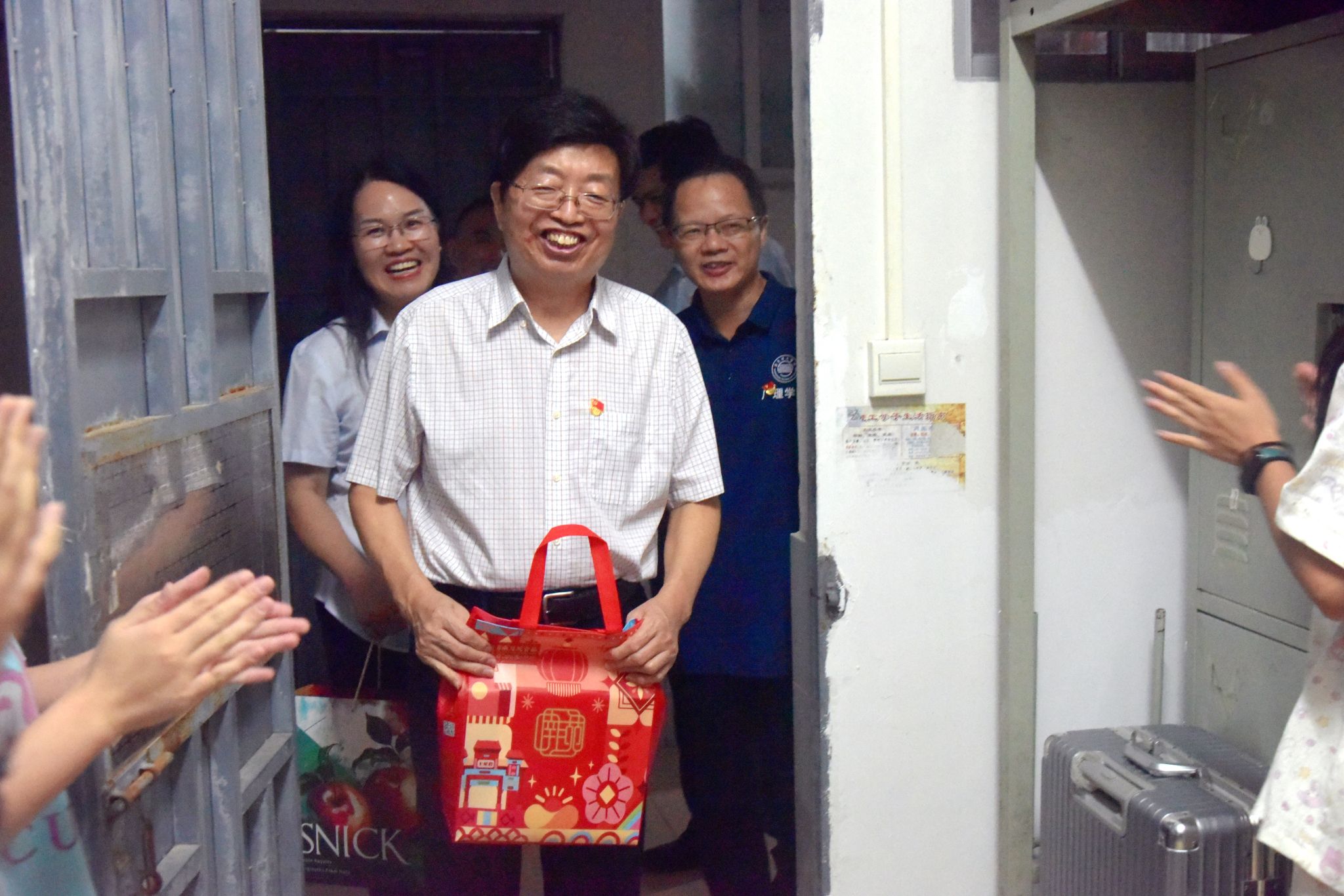 本网讯(宣传部)9月17日晚,中秋之夜,bat365官网党委书记胡海建、副校长刘香萍等一行,怀揣着满满的节日祝福,携带精心准备的月饼和水果,深入校园各个角落,包括老教授办公室、新教师办公室、学生宿舍、宿管区以及保安室,开展了一场全面的走访慰问活动。