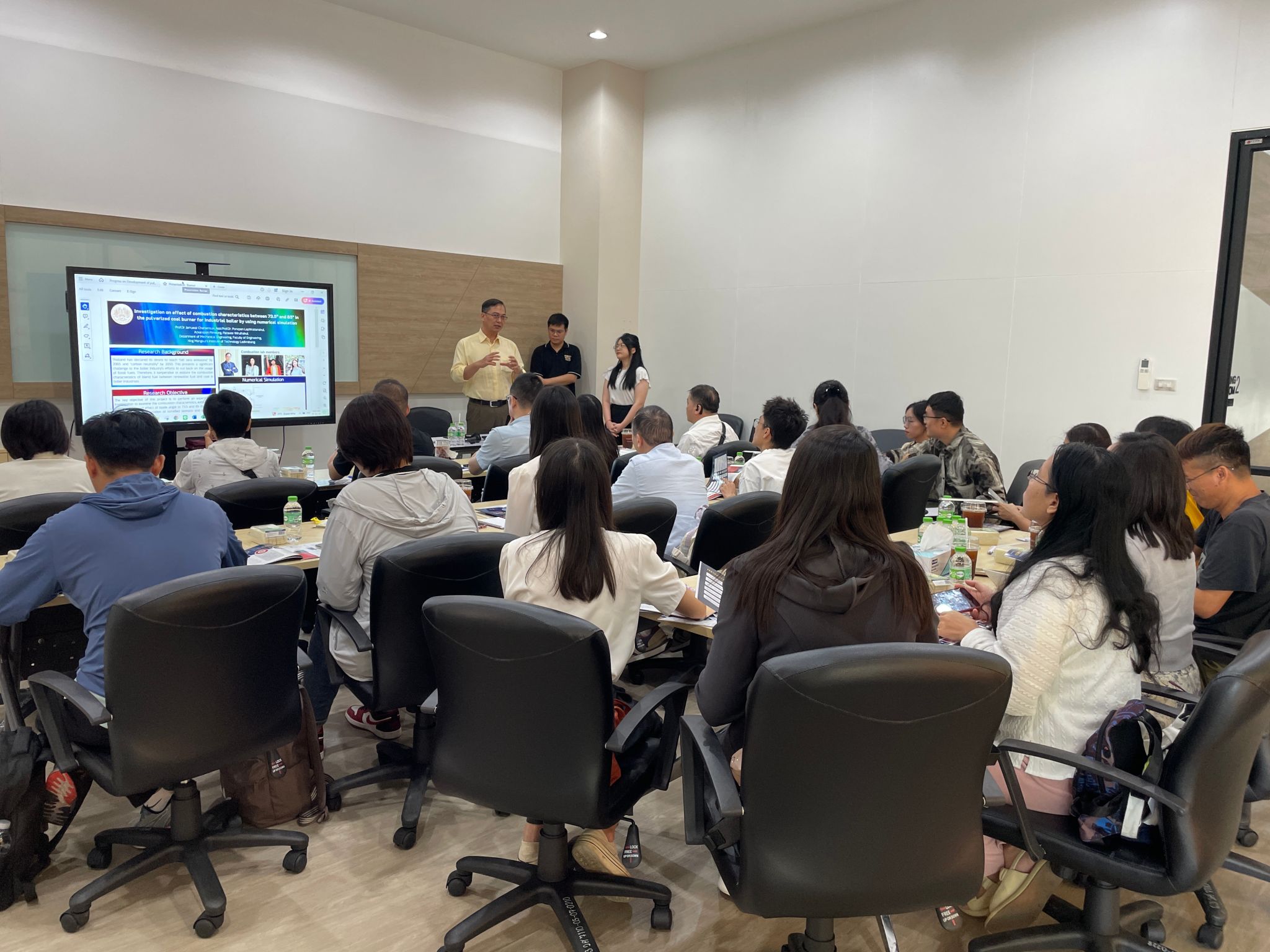 泰国先皇理工大学(简称KMITL)成立于1960年,是一所以工科见长,学术实力强劲,校园环境优美,且拥有广泛国际交流合作的泰国顶尖公立大学。在这里,学校代表团不仅参观了该校的教学设施、科研项目以及校园文化,深入了解了泰国先皇理工大学的教学理念和方法,还参观了学校的实验室和工作室,聆听了Jarruwat Charoeneuk教授生物燃烧器这一创新技术研究成果的分享,并就设备是否与企业合作并投入使用等问题与教授进行了深入交流,为bat365官网教师在科技创新道路上提供了新的灵感与思路。