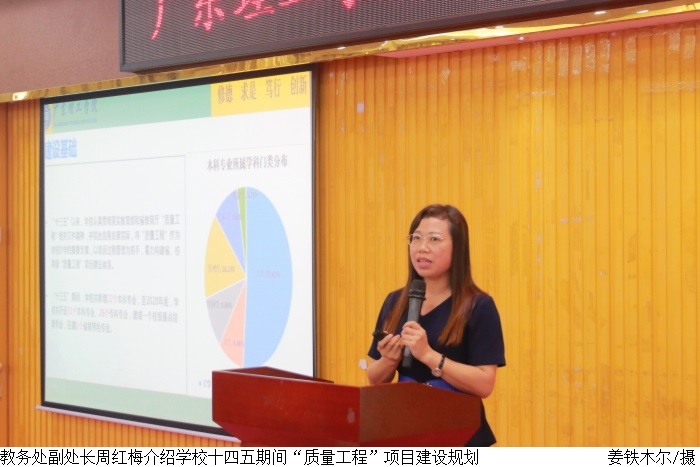 副校长刘香萍就“质量工程”建设目的、意义及建设内容等方面作简要介绍,她指出,“质量工程”建设应以问题为导向,提前做好统筹规划,加强过程管理。