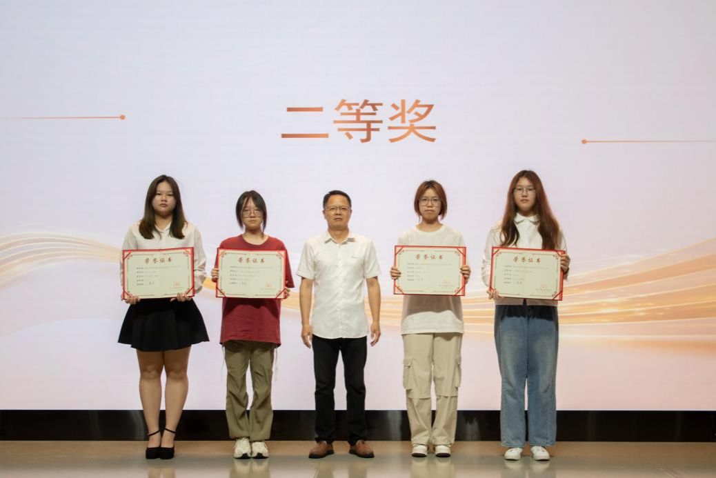 获得二等奖的选手分别是李旭如《八卦镬居:古韵交织的回响》(指导老师:陈圣语、郑晓涵),蓝金燕、徐佳仪《蝠韵蝶章》(指导老师:方琳),周人静秋、梁樱《青花山水纹觚》(指导老师:文雅),周琦、何海宁、张紫嫣《五“蝠”临门印章礼盒包装设计》(指导老师:朱铁男、汪佳莹),由艺术设计学院常委书记赵宁上台为获奖选手颁奖;