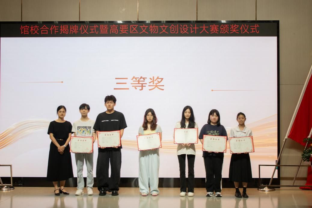获得三等奖的选手分别是陈楠英《岩韵玉粽》(指导老师:伍玛莉),温佳乐《文明塔书立》(指导老师:农旭安),叶柳佃、麦诗潆、曾晶晶《肇庆市高要区博物馆纪念币设计——疍家文化》(指导老师:汪佳莹、朱铁男),郑恺悦、邹姗珊《青韵砚灵》(指导老师:吴琼),谢秋雨、巫董琪、张豪丽《瓷韵华光,映载清辉》(指导老师:徐舒平、陈苒染),向柏翰、刘渝飞扬、曾秋珊《万古长青印章礼盒包装设计》(指导老师:朱铁男、汪佳莹),由艺术设计学院院长陈彩云上台为获奖选手颁奖;