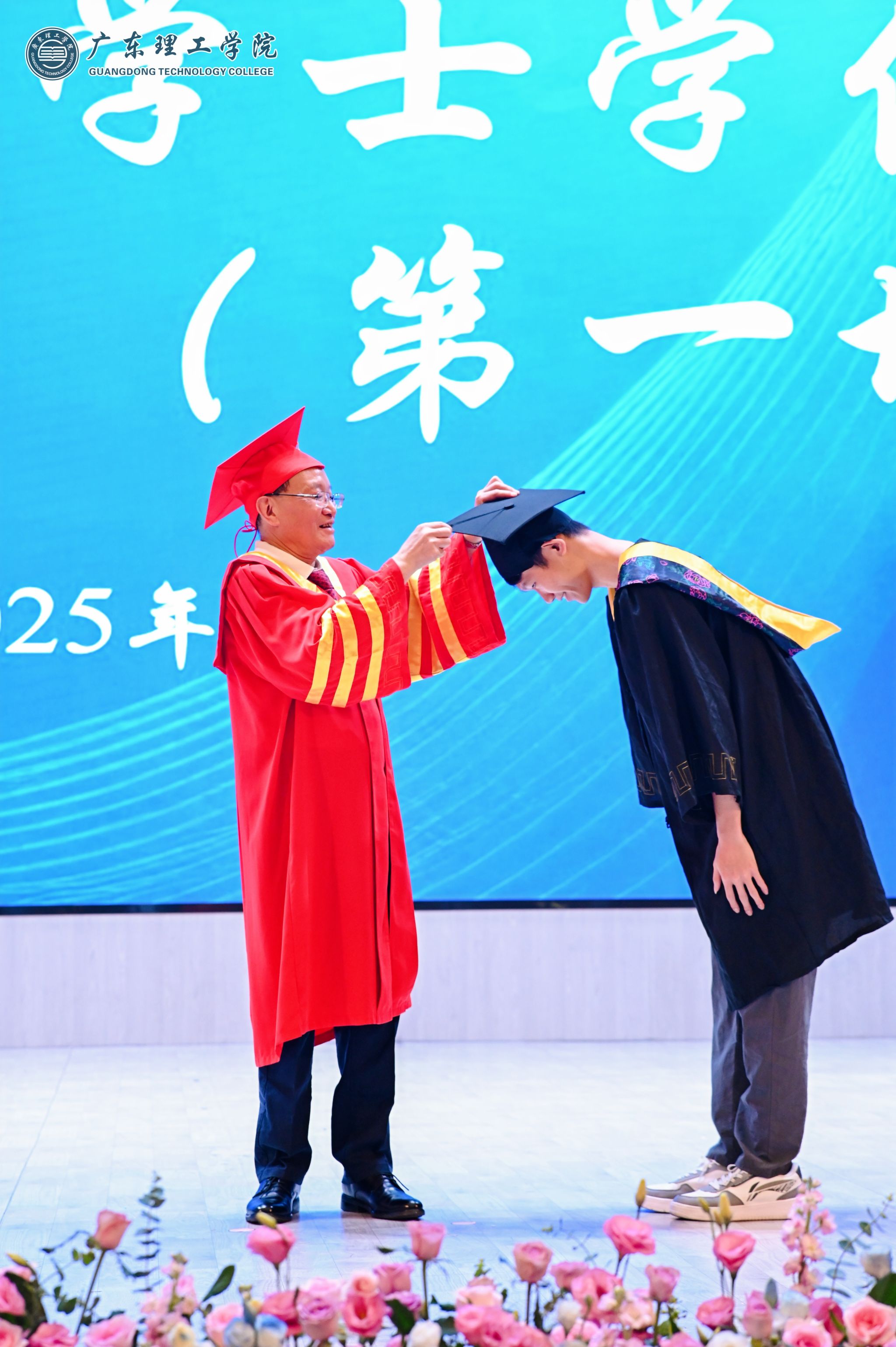 在随后的2025 届学士学位授予仪式上,副校长刘香萍宣读《关于授予2025 届本科毕业生普通高等教育学士学位的决定》。校长陈晓阳为获学士学位的学生代表颁授学位证书,为其拨穗正冠并合影留念。