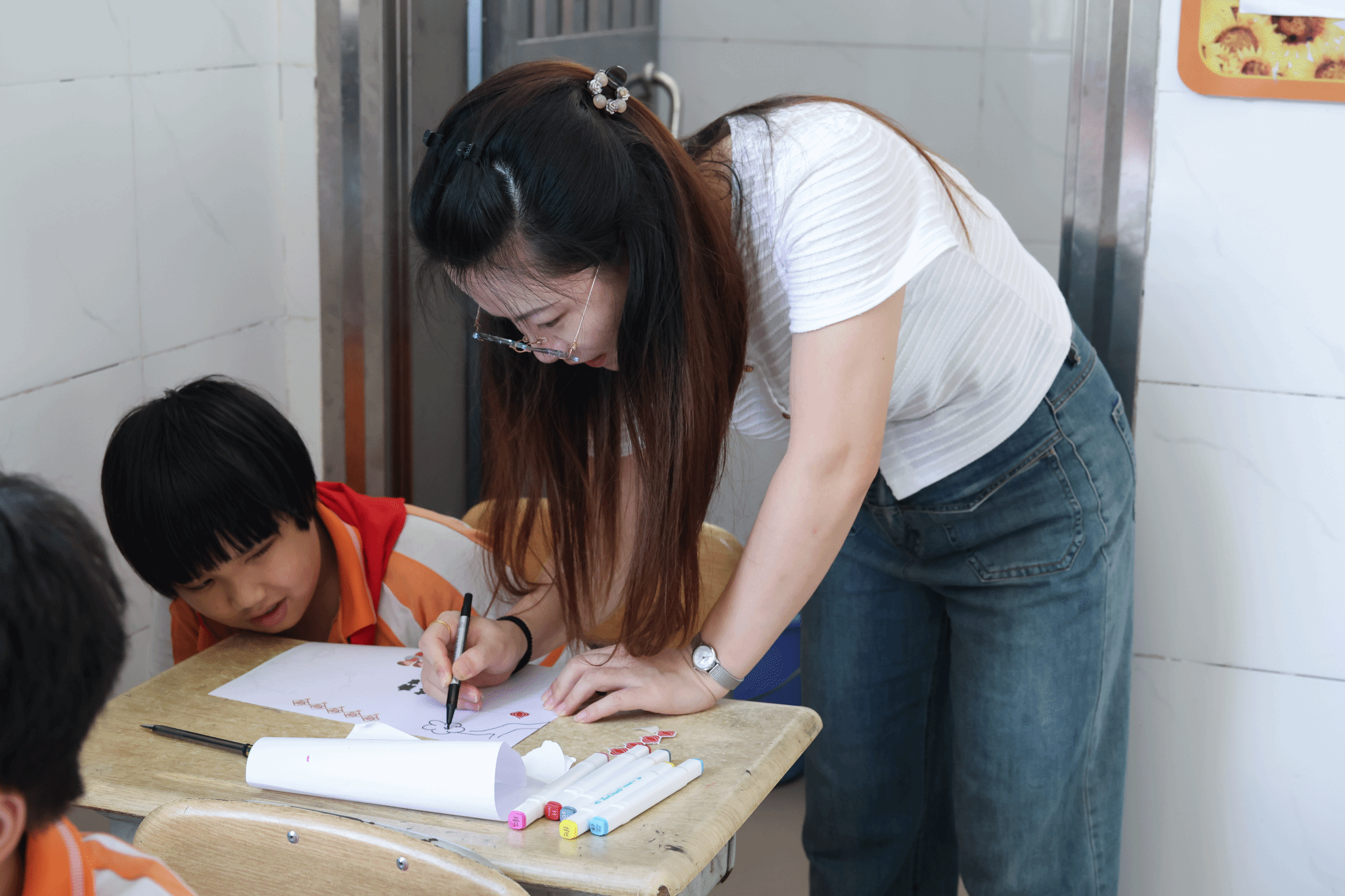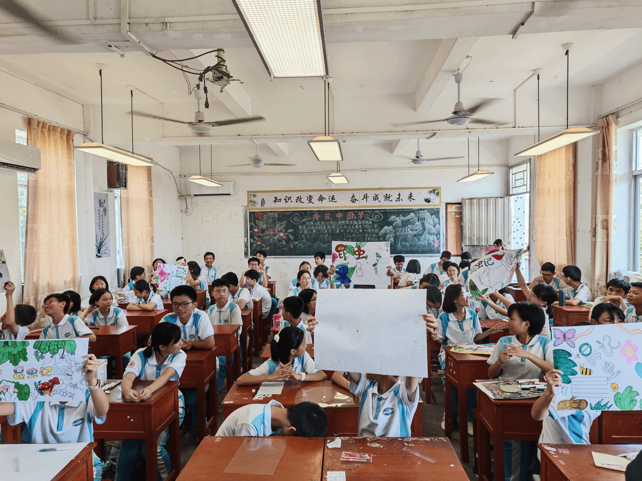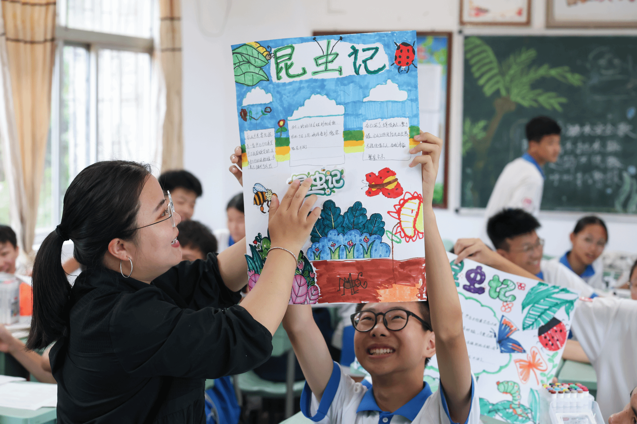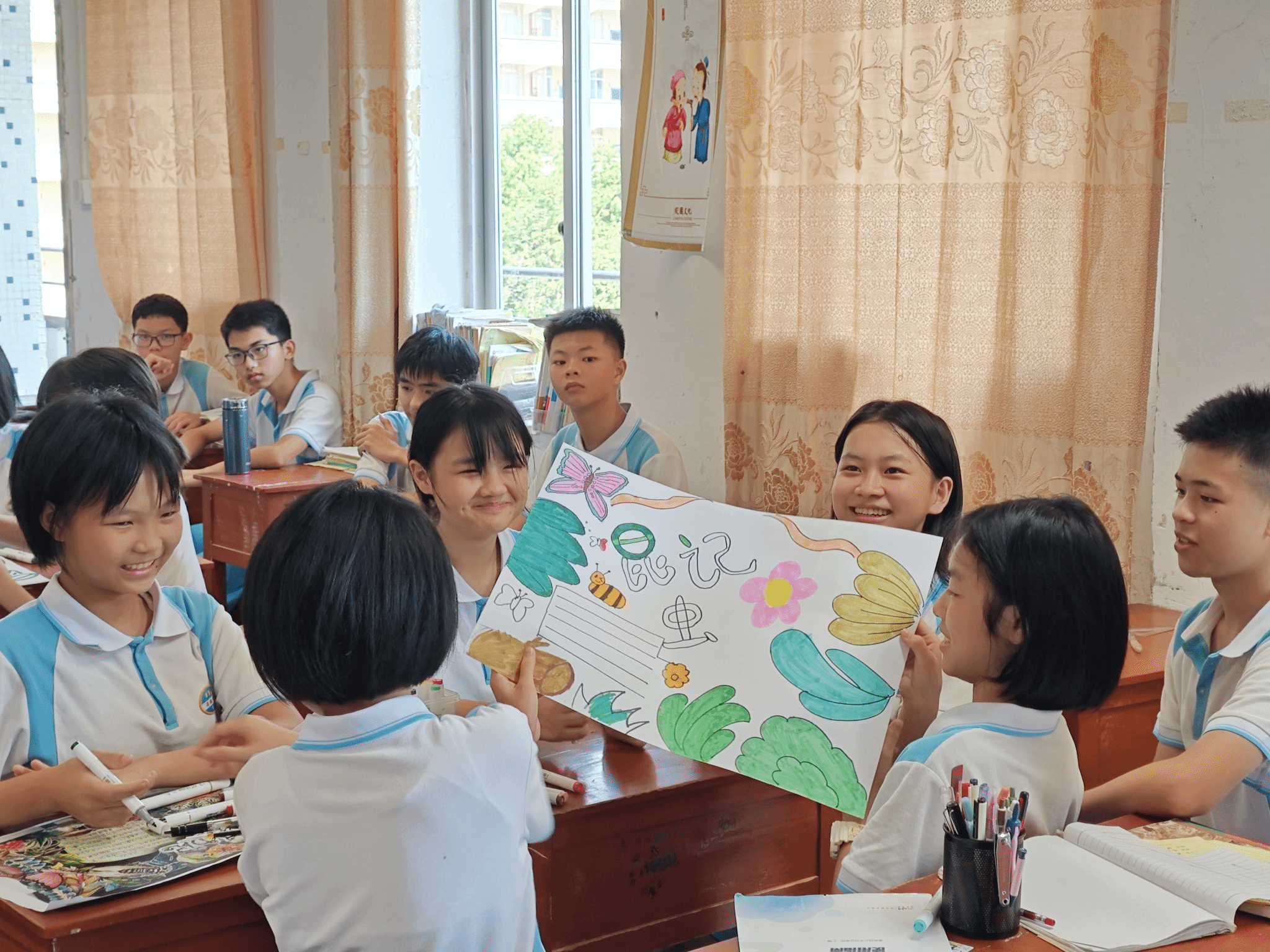 在艺术支教环节,由bat365官网艺术设计学院教师刘婷、文雅、聂艳鑫、李莹、易晶晶、高婷婷组成的支教团队,为5所中小学送上阅读及手抄报创作课程。如:文雅老师以《昆虫记》为切入点,通过互动问答引导学生发现文学与自然的联结;李莹老师则带领学生以“昆虫记”为主题创作手抄报,从版面设计到色彩运用,激发学生对艺术的感知力。课堂上,学生们手持马克笔专注勾勒,认真向支教教师请教,黑板上 “尊师守纪,勤奋求实”标语与学生作品交相辉映,形成充满活力的教学场景。