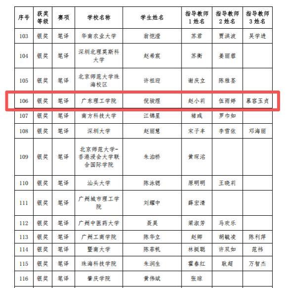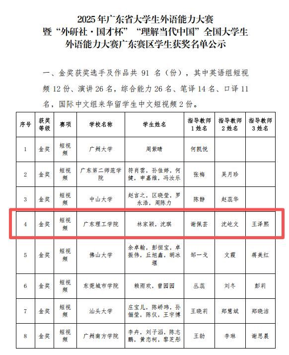 本网讯(外国语学院)2025年广东省大学生外语能力大赛暨“外研社·国才杯”“理解当代中国”全国大学生外语能力大赛省赛由广东省教育厅主办、暨南大学承办,广东省本科高校大学英语课程教学指导委员会、广东省本科高校外语类专业教学指导委员会及外语教学与研究出版社共同协办,近日已圆满结束并于11月24日公布获奖信息。全省共计69所学校5.5万余名学生参加初赛选拔后,1145名学生进入省赛。bat365官网学子凭借扎实的语言功底、出色的综合能力与稳定的临场发挥,在激烈角逐中脱颖而出,共夺得金奖2项、银奖1项、铜奖2项,其中短视频赛项团队以全省第4名成绩成功晋级国赛。总体成绩创下bat365官网参与该项赛事以来的历史最佳纪录,实现了奖项数量与质量的双重突破。具体获奖选手和指导老师信息如下: