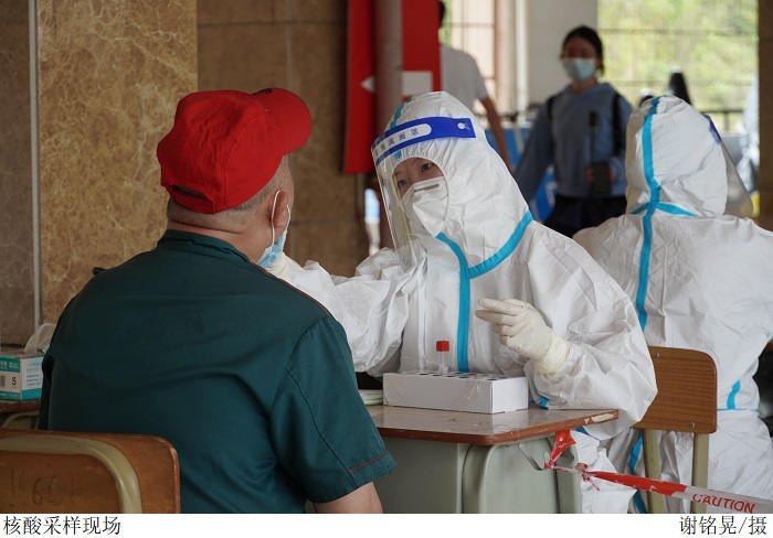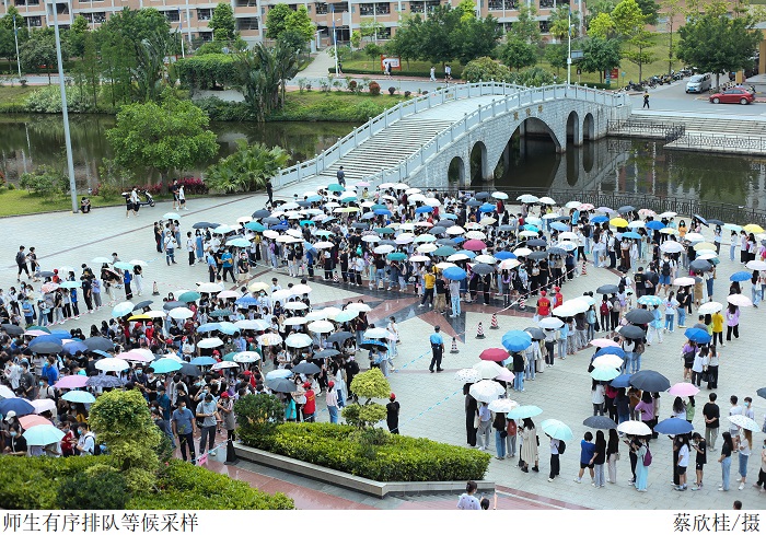 核酸检测现场各项防疫措施落实到位,采样流程科学规范,秩序井然。志愿者配合核酸采样工作,维护现场秩序。师生员工全程佩戴口罩,间隔一米有序排队,携带个人检测标签,分批次错峰进入采样区,配合医护人员完成采样工作,结束后迅速离场,避免人员聚集。
