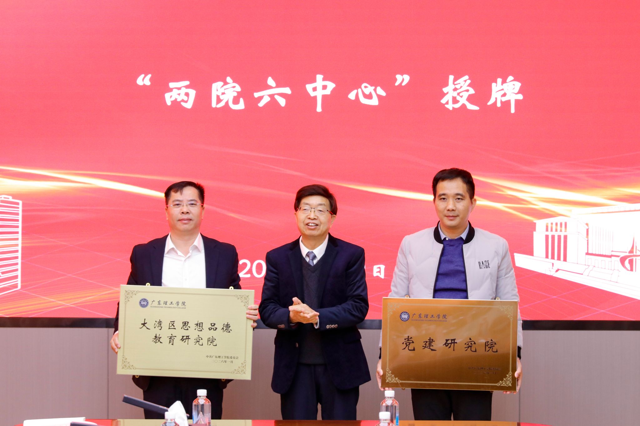 在热烈的掌声中,与会校领导共同为“新时代党建与思政工作创新发展研究院”揭牌。红绸轻启,标志着学校党建与思政工作迈入创新融合新阶段。随后,胡海建、陈晓阳为“两院六中心”授牌。