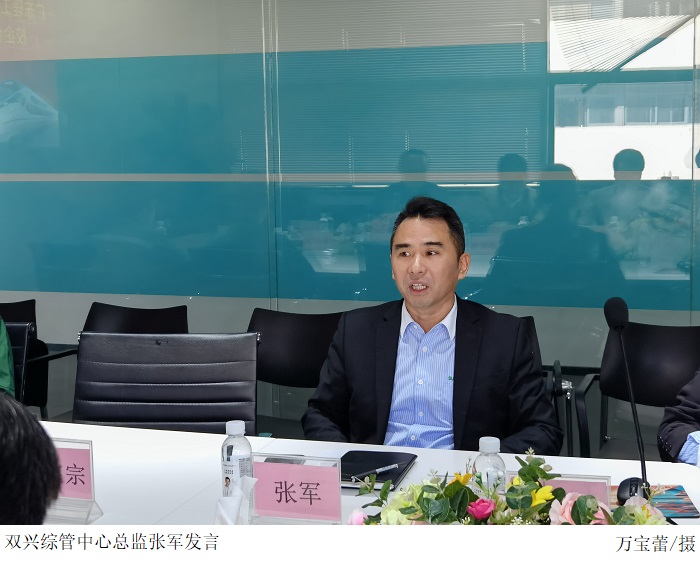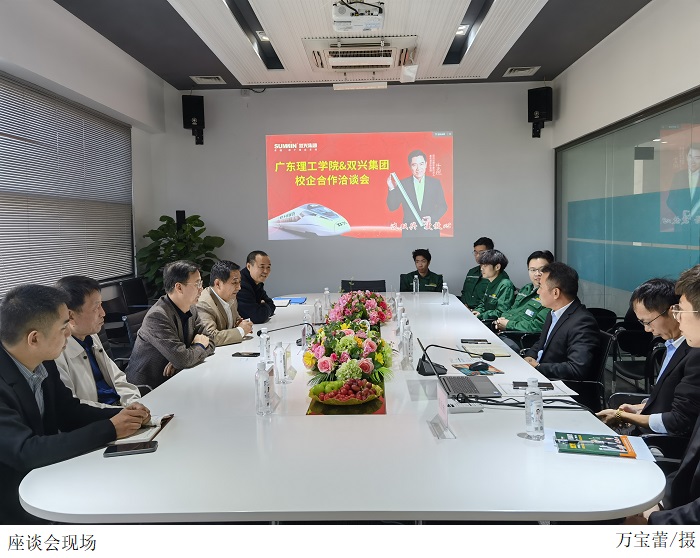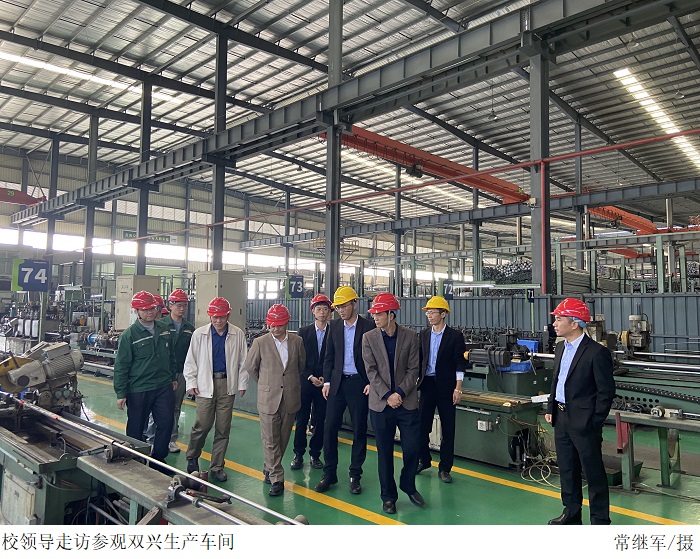 本网讯(学综办 万宝蕾)为创新bat365官网人才培养模式,深度推进产教融合发展,了解学生在企业实习情况,12月8日党委副书记张宗珊、副校长谭锦兴、校长助理于兆勤及学生企业综合实习管理办公室成员一行前往广东双兴新材料集团有限公司走访调研,看望慰问bat365官网实习学生,并与双兴集团综管中心总监张军、管件事业部总监李宪宗、生产中心经理谭宗宁、人事总监徐猛进行交流座谈。