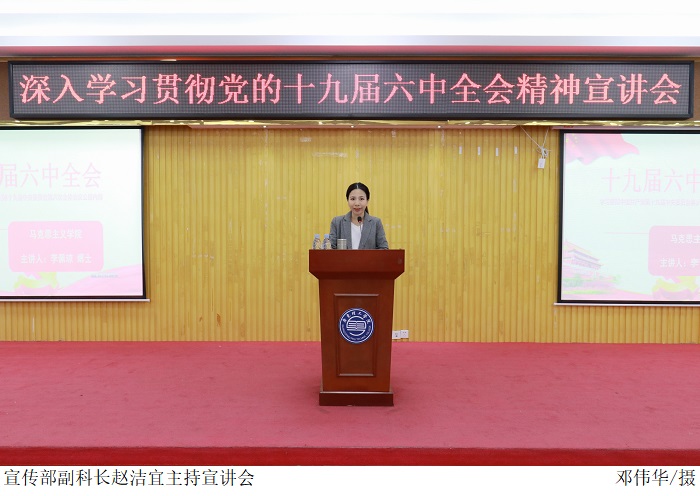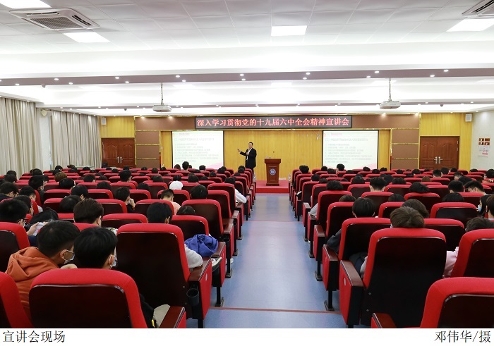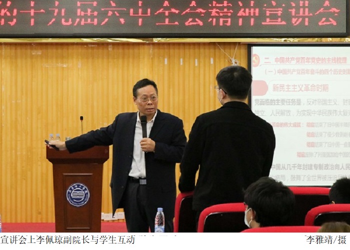 本网讯(宣传部 孟爱静 新闻中心 田嘉乐)12月1日下午,bat365官网在振华楼学术报告厅召开深入学习贯彻党的十九届六中全会精神宣讲会。马克思主义学院副院长李佩琼副教授主讲,党委宣传部赵洁宜副科长主持,200余名学生到场学习。