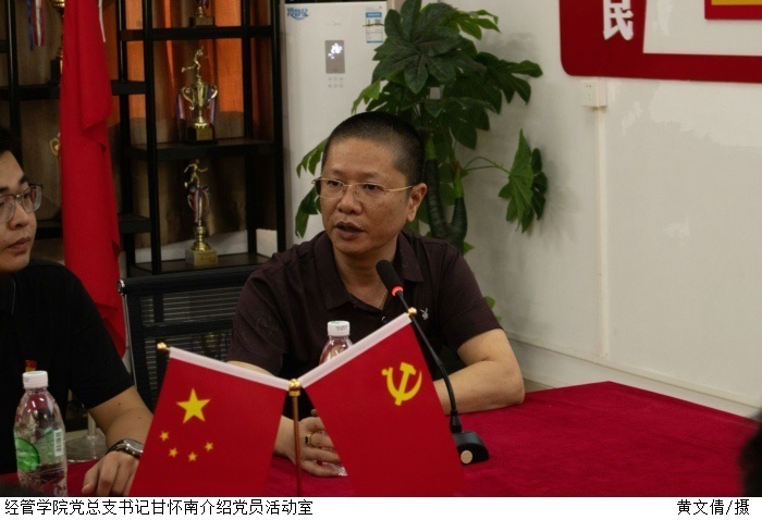 甘怀南表示,经管学院党史活动室建设是学院各方努力的成果,随后汇报了经济管理学院党史学习教育的整改工作。整改工作针对10月28日校党委书记张东生到鼎湖校区督导党史学习教育时,指出党员活动室建设存在的不足之处,对党史学习教育的PPT课件内容、书籍,以及宣传栏的图文设置等方面进行完善。