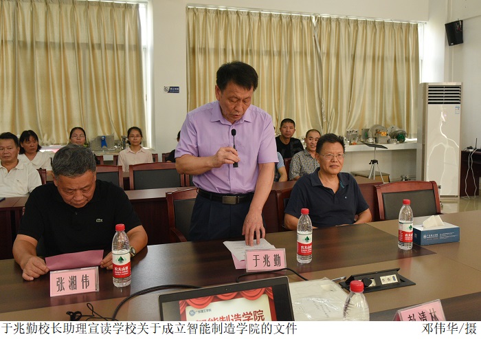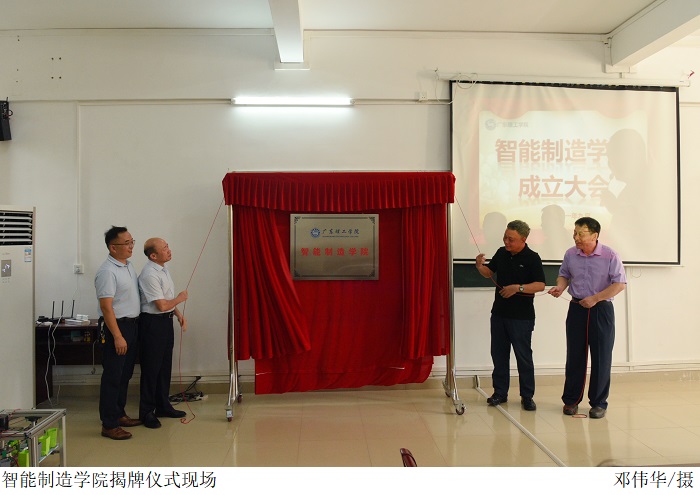 于兆勤校长助理宣读学校关于成立智能制造学院的文件,公布智能制造学院院长、副院长、党总支书记和副书记等职位聘任名单后,张湘伟校长、于兆勤校长助理、智能制造学院伍先明院长、党总支彭清林书记为“智能制造学院”揭牌。