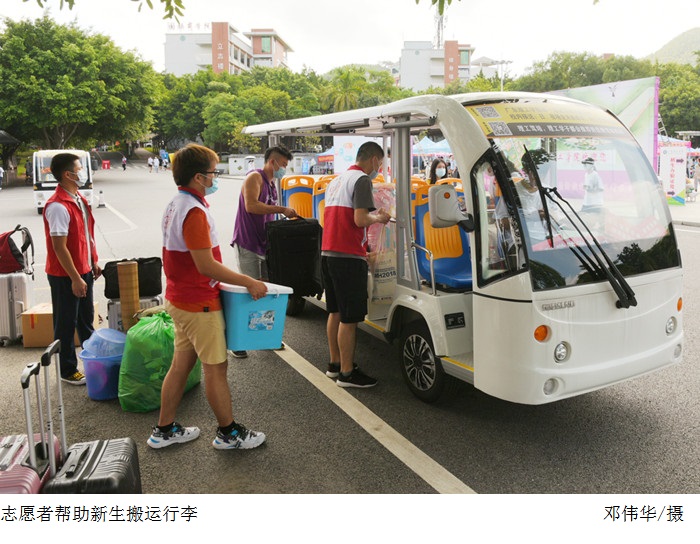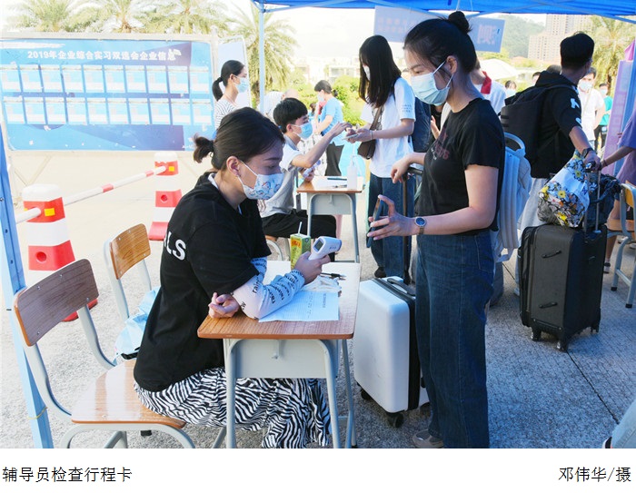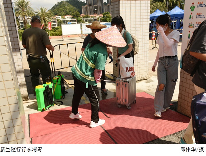 朱副主任指出,学校高度重视学生健康安全,校园疫情防控工作不容松懈,新生报到时安排专人测温检查粤康码和行程卡,之后为新生行李消毒并协助指引新生报道入宿;随行家长须在校外等候;另外学校还提前对学生宿舍进行了消杀工作;安排辅导员轮班负责登记新生到校情况,并在新生入校时为其发放一次性口罩。