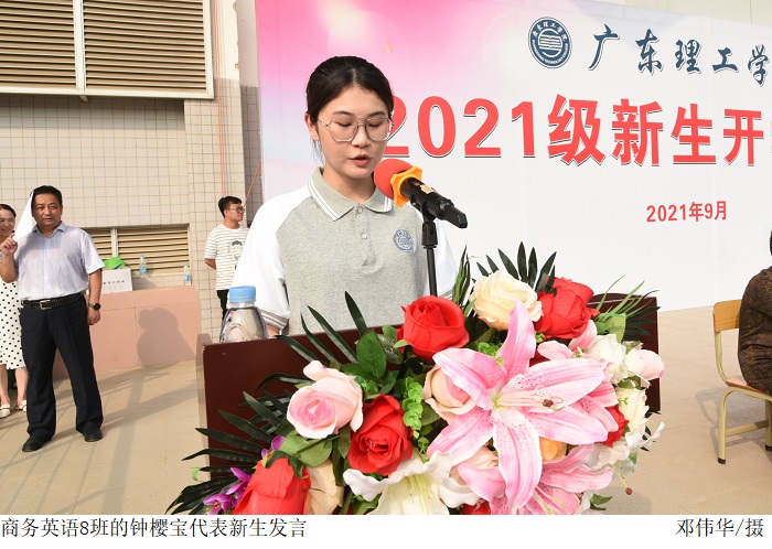外国语学院商务英语8班的钟樱宝代表新生发言。她表示,青年是与新时代同行、共同进步的一代。作为一名大学新生,她对大学生活充满期待和憧憬。同时,作为一名新时代青年,她清楚自己肩上的责任,并对自己提出要求:要珍惜时间,尽快熟悉校园环境;脚踏实地,学好专业知识,为实现中华民族伟大复兴贡献自己的智慧和力量;积极参与学校组织的各类活动,不断提高和完善自己。